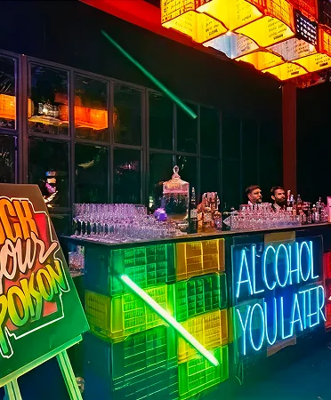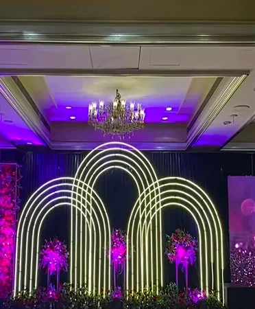 Neon Jungle is a sensory explosion where lush tropics collide with bold neon lights, creating an unforgettable event atmosphere. Think glowing tunnels, electric bars, edgy backdrops, and futuristic floral vibes — every corner pulses with energy. Let your love glow wild in India’s boldest jungle-inspired celebration.