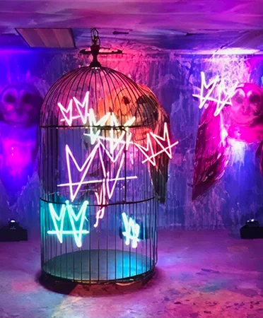 A vibrant, jungle-inspired wedding with neon lights, electric décor, and unforgettable energy.